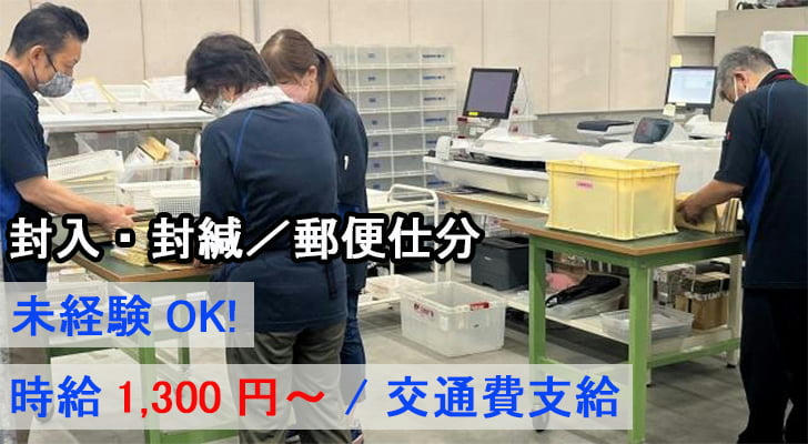 空調完備の快適な環境で、郵便物の仕分け・ラベル貼り・封入作業などを行う軽作業です。